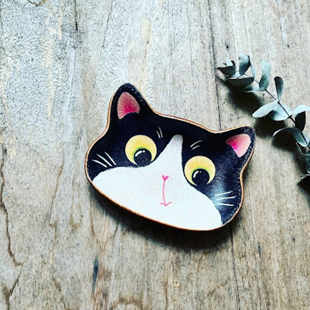 植物鞣革牛皮,手工繪製、縫製塑型後成為獨一無二的皮革貓造型盤。可放置飾品、裝飾、收錢盤。