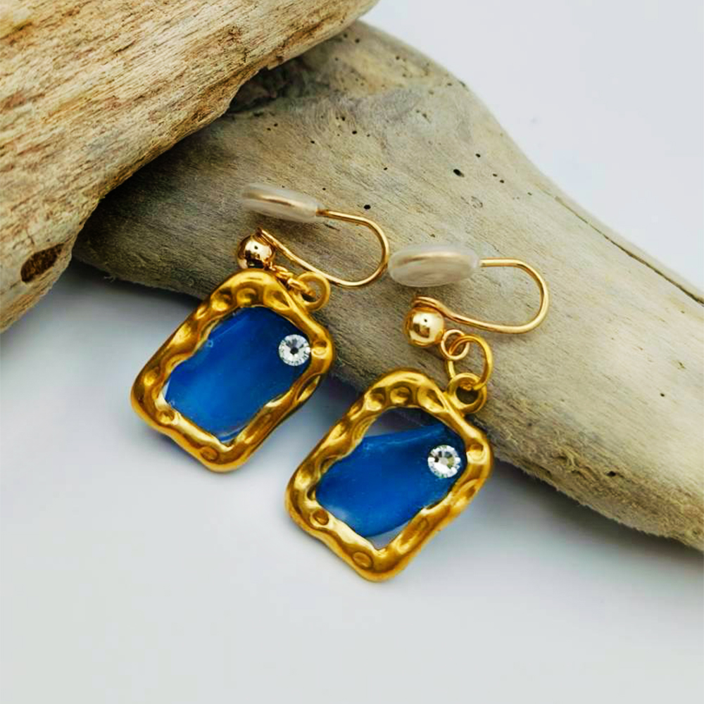 嚴選天然深藍海玻璃,搭配精緻金色造型框,每對耳環獨一無二。尺寸約2~2.5公分內(不含耳鉤)。