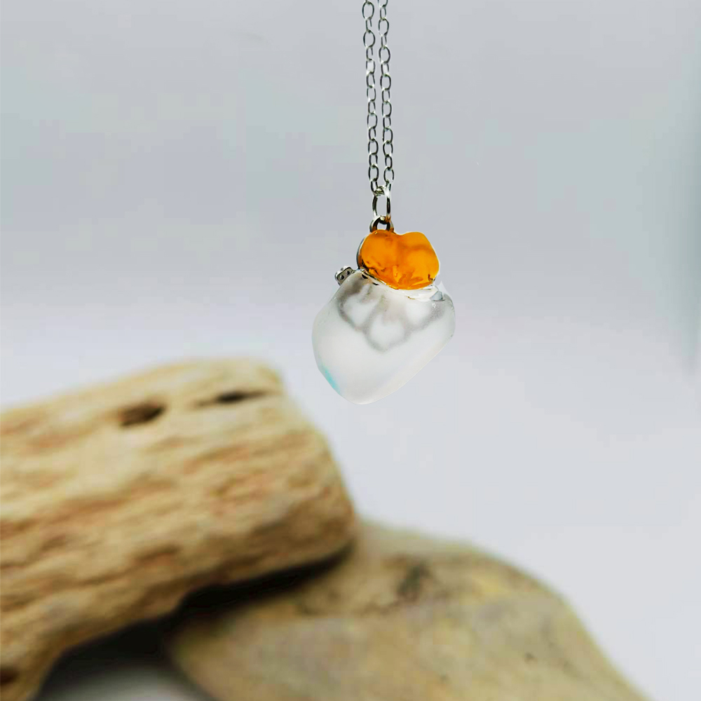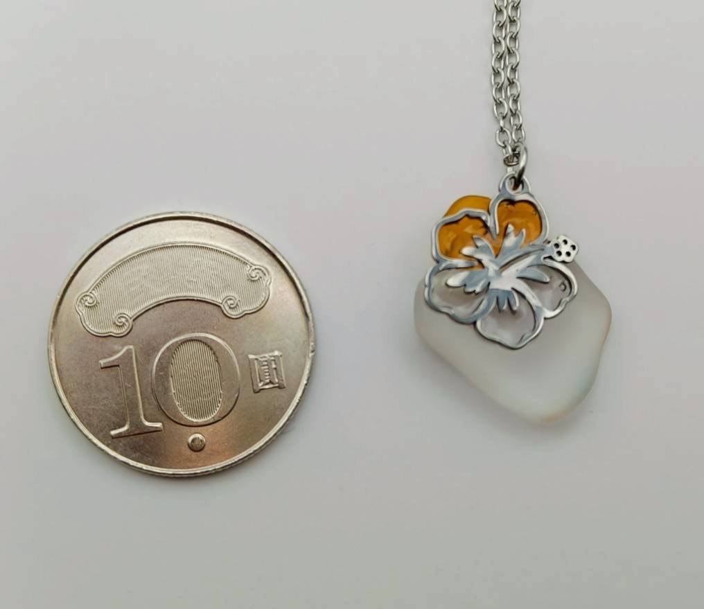 以透明與橘色天然海玻璃手工拼接搭配花朵造型金屬飾件,項鍊總長約453公分內(含金屬飾件)。