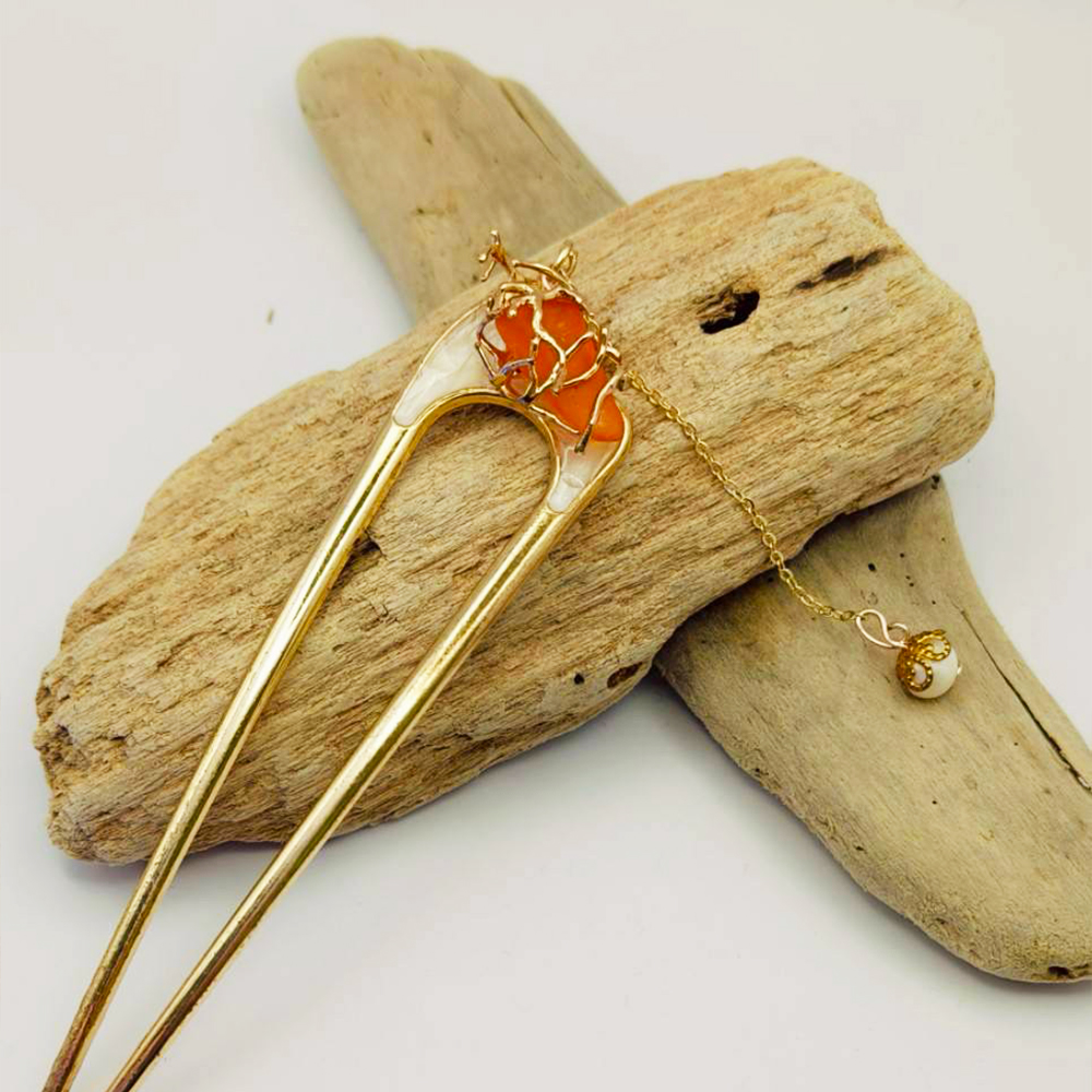 選用天然海玻璃搭配手作風格髮叉設計,將大海賜予的玻璃寶石鑲嵌於盤髮飾品中,展現海洋元素與日常優雅的結合。 特別選用稀有橘色與深紅色海玻璃作為主石,在UV燈照射下會釋放神秘螢光,彷彿海底星光,極具收藏與佩戴特色。 天然霧面質感與原石圓潤曲線保留每一片海玻璃的獨特性,是結合自然美學與環保理念的日常飾品選擇。